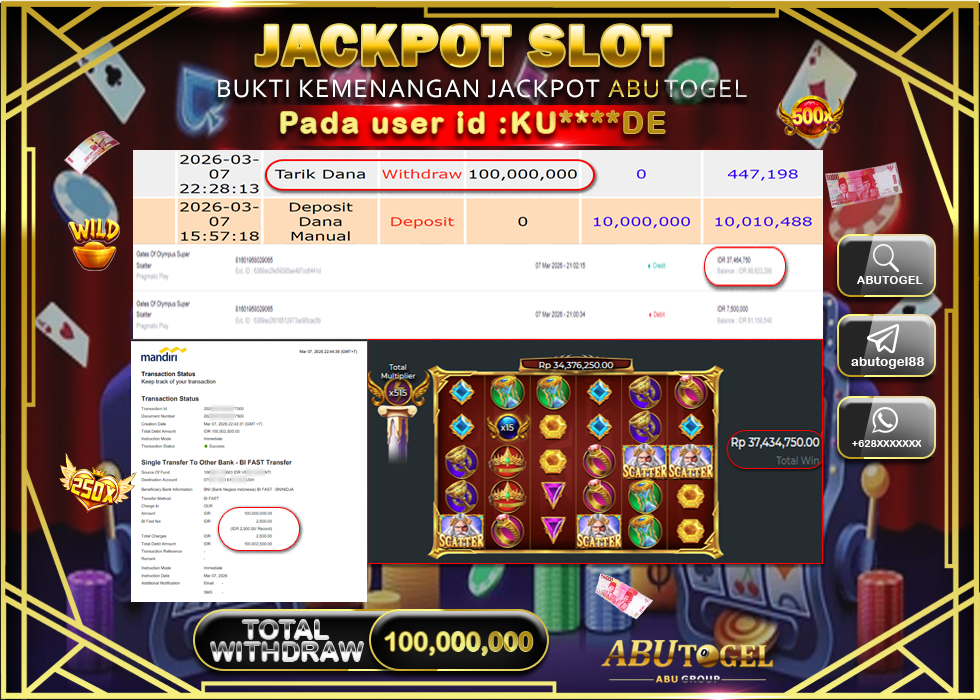 Bukti Jackpot Slot Online ABUTOGEL Minggu, 08 Maret 2026 – ABUTOGEL adalah bo online terpercaya. Berikut ini kami berikan info bukti jackpot member ABUTOGEL yang sudah kami bayar lunas dalam permainan slot online.