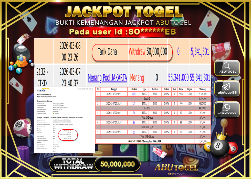 Bukti Jackpot Togel Online ABUTOGEL Minggu, 08 Maret 2026 50,000,000 - LUNAS