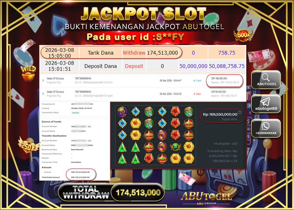 Bukti Jackpot Slot Online ABUTOGEL Minggu, 08 Maret 2026 174,513,000 - LUNAS