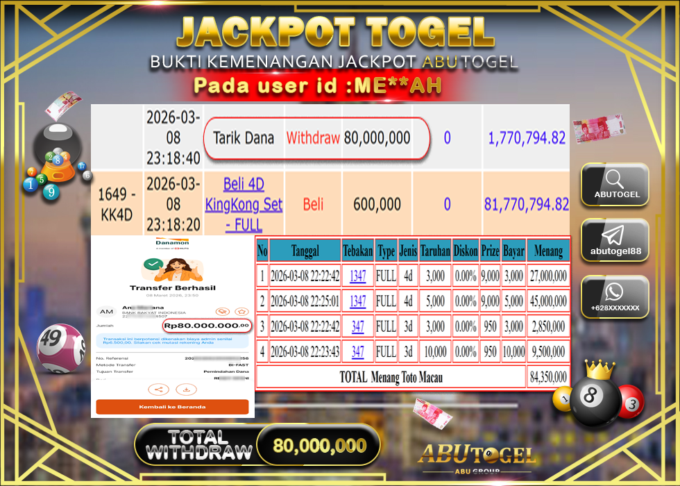 Bukti Jackpot Togel Online ABUTOGEL Senin, 09 Maret 2026 80,000,000 - LUNAS