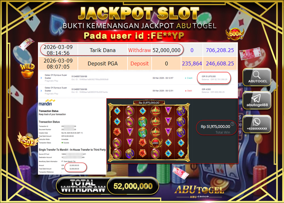 Bukti Jackpot Slot Online ABUTOGEL Senin, 09 Maret 2026 52,000,000 - LUNAS