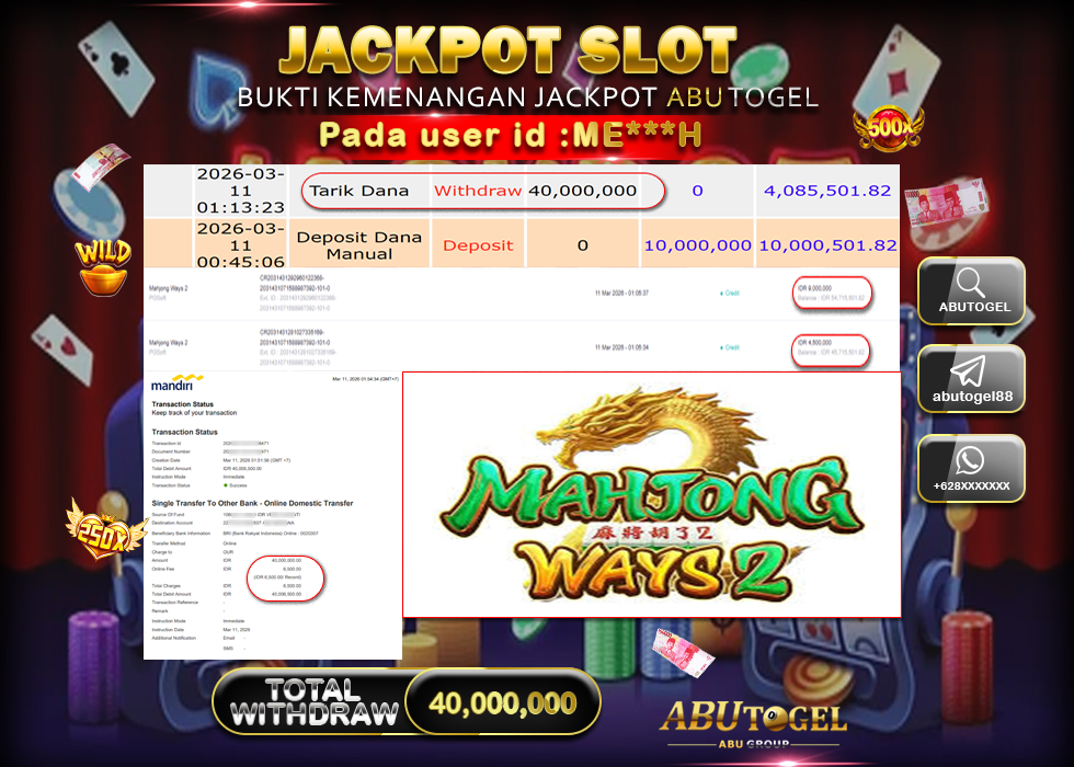 Bukti Jackpot Slot Online ABUTOGEL Rabu, 11 Maret 2026 40,000,000 - LUNAS