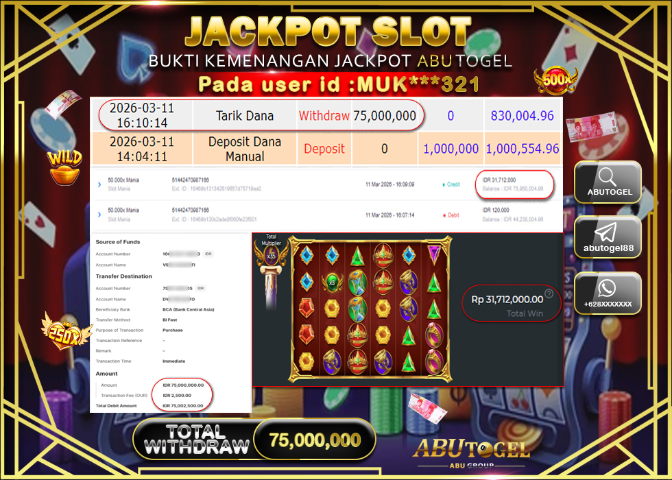 Bukti Jackpot Slot Online ABUTOGEL Rabu, 11 Maret 2026 Rp 75,000,000 - LUNAS