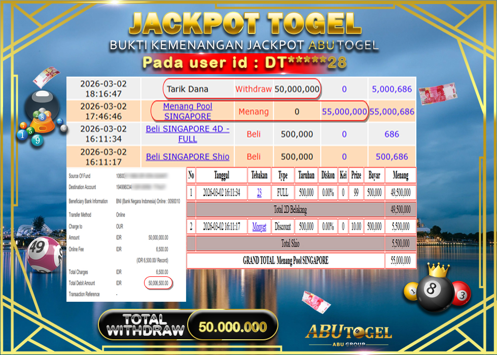 Bukti Jackpot Togel Online ABUTOGEL Senin, 02 Maret 2026 – ABUTOGEL adalah bo online terpercaya. Berikut ini kami berikan info bukti jackpot member ABUTOGEL yang sudah kami bayar lunas dalam permainan Togel Online.