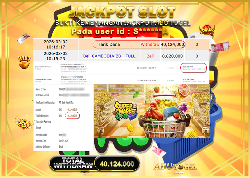 Bukti Jackpot Slot Online ABUTOGEL Senin, 02 Maret 2026 Rp 40,124,000 - LUNAS