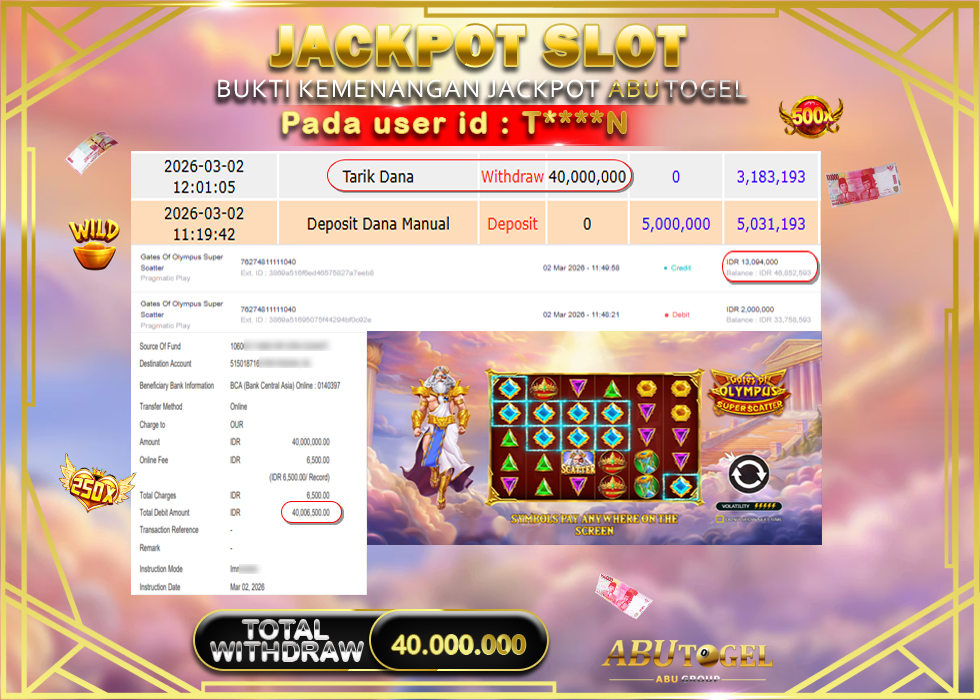 Bukti Jackpot Slot Online ABUTOGEL Senin, 02 Maret 2026 Rp 40,000,000 - LUNAS