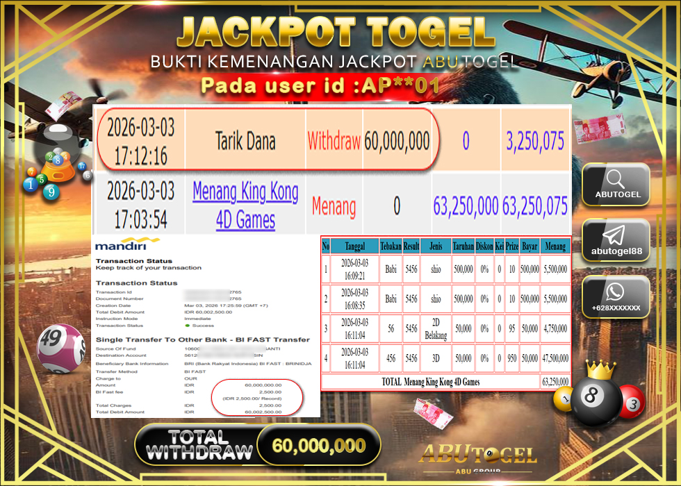 Bukti Jackpot Togel Online ABUTOGEL Selasa, 03 Maret 2026 Rp 60,000,0000 - LUNAS
