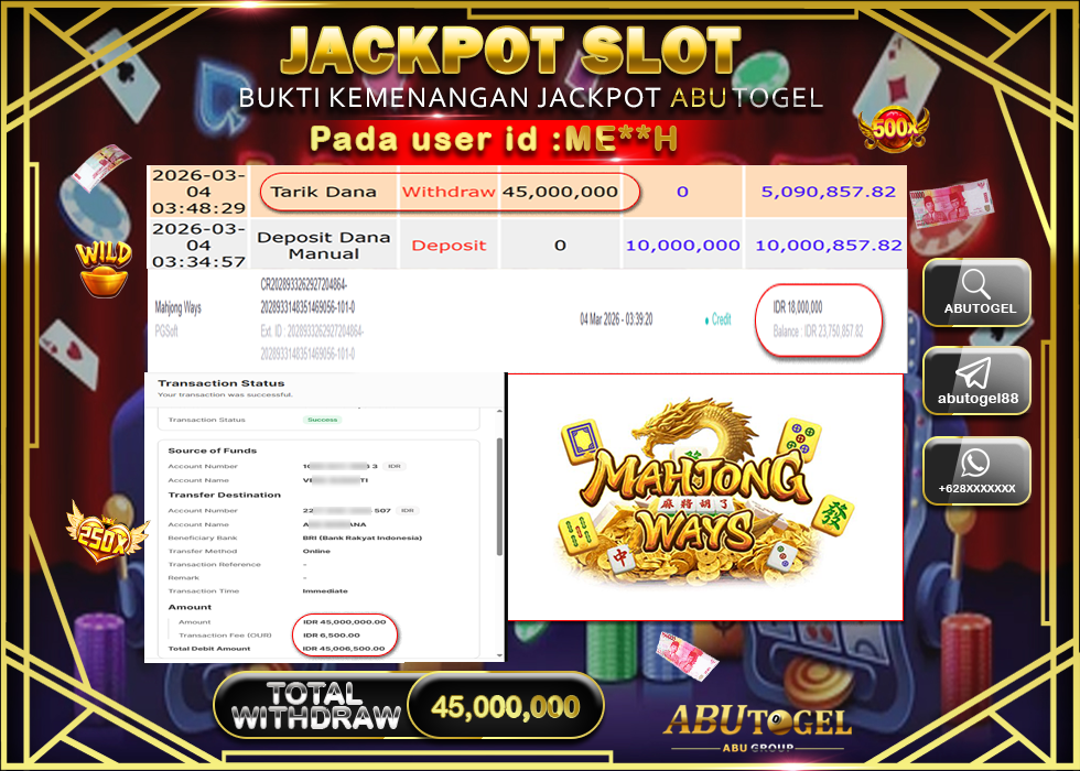 Bukti Jackpot Slot Online ABUTOGEL Rabu, 04 Maret 2026 Rp 45,000,000 - LUNAS