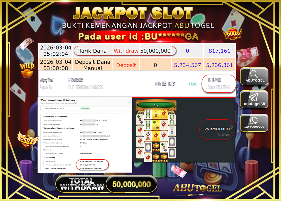 Bukti Jackpot Slot Online ABUTOGEL Rabu, 04 Maret 2026 Rp 50,000,000 - LUNAS