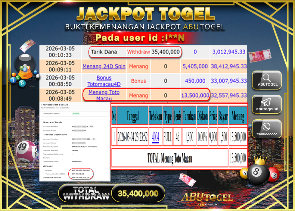 Bukti Jackpot Togel Online ABUTOGEL Kamis, 05 Maret 2026 Rp 35,400,000 - LUNAS