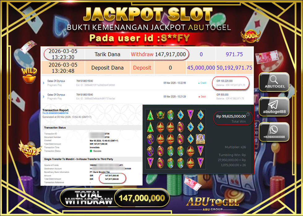 Bukti Jackpot Slot Online ABUTOGEL Kamis, 05 Maret 2026 Rp 147,917,000 - LUNAS
