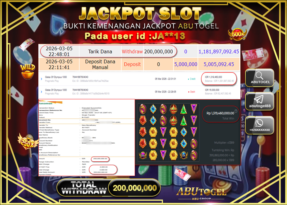 Bukti Jackpot Slot Online ABUTOGEL Kamis, 05 Maret 2026 – ABUTOGEL adalah bo online terpercaya. Berikut ini kami berikan info bukti jackpot member ABUTOGEL yang sudah kami bayar lunas dalam permainan slot online.