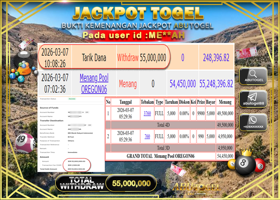 Bukti Jackpot Togel Online ABUTOGEL Sabtu, 07 Maret 2026 Rp 55,000,0000 - LUNAS