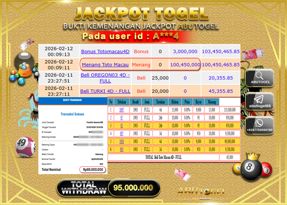 Bukti Jackpot Togel Online ABUTOGEL Kamis, 12 February 2026 95,000,000 - LUNAS