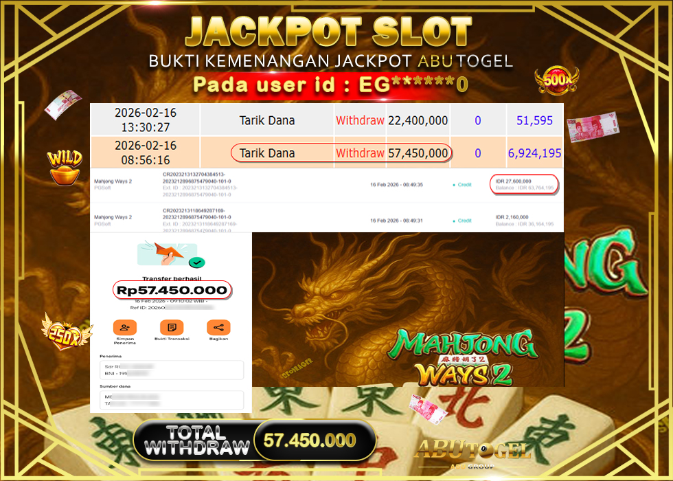 Bukti Jackpot Slot Online ABUTOGEL Senin, 16 February 2026 – ABUTOGEL adalah bo online terpercaya. Berikut ini kami berikan info bukti jackpot member ABUTOGEL yang sudah kami bayar lunas dalam permainan slot online.