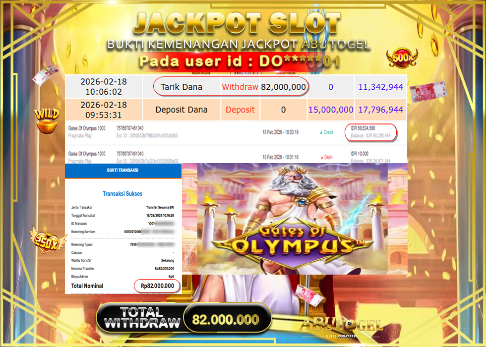 Bukti Jackpot Slot Online ABUTOGEL Rabu, 18 February 2026 Rp 82,000,000 - LUNAS