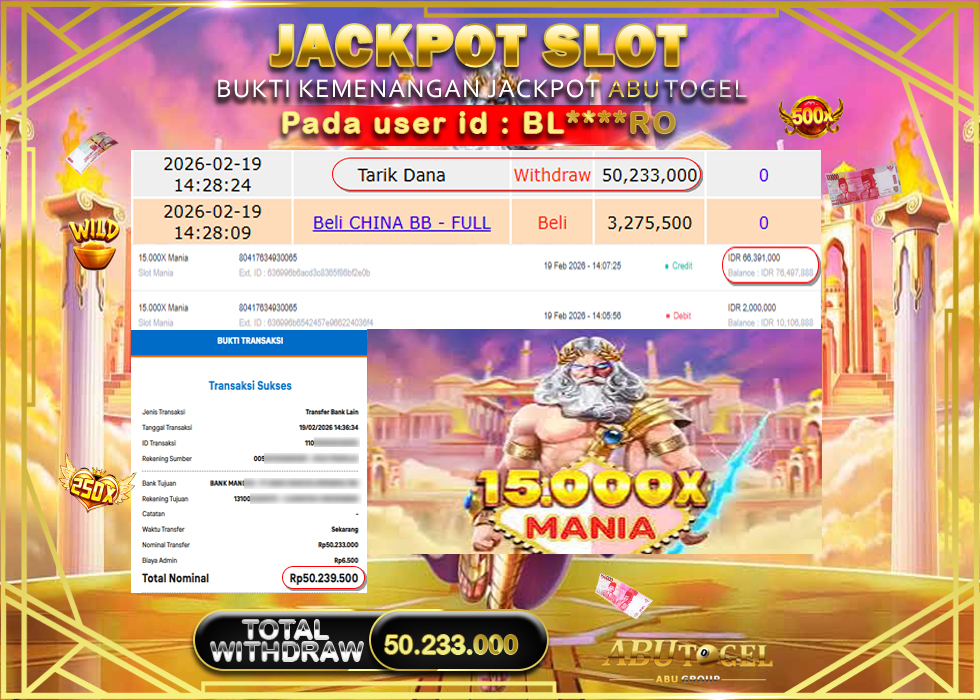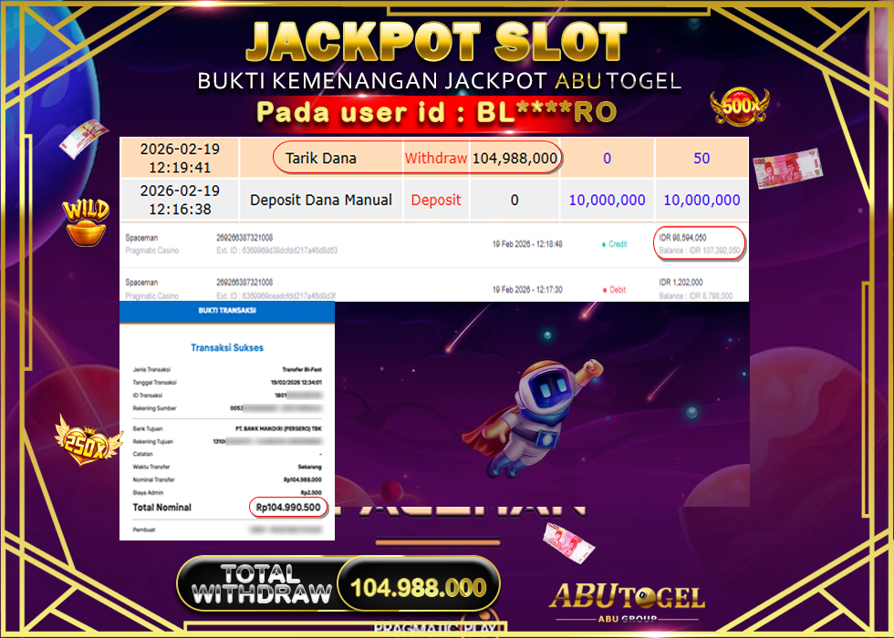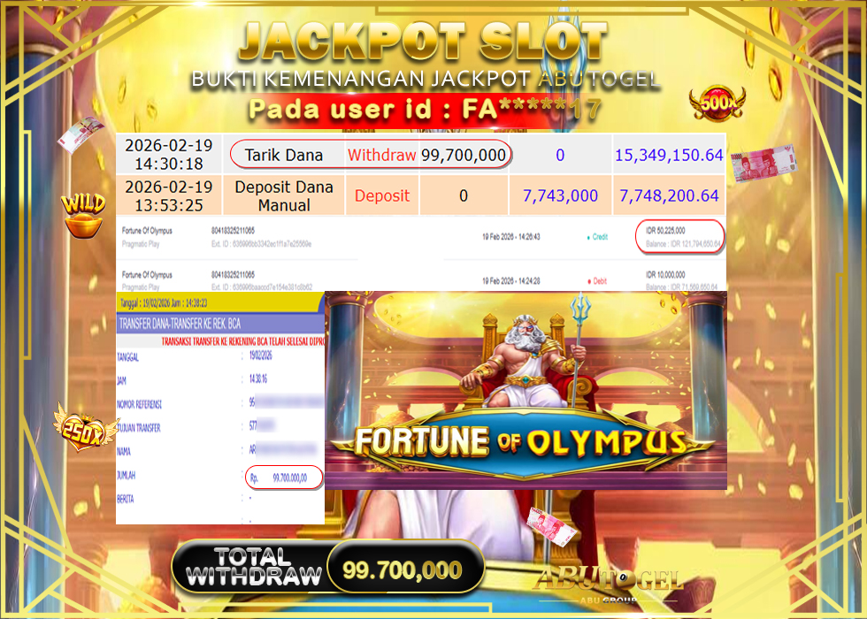 Bukti Jackpot Slot Online ABUTOGEL Kamis, 19 February 2026 – ABUTOGEL adalah bo online terpercaya. Berikut ini kami berikan info bukti jackpot member ABUTOGEL yang sudah kami bayar lunas dalam permainan slot online.