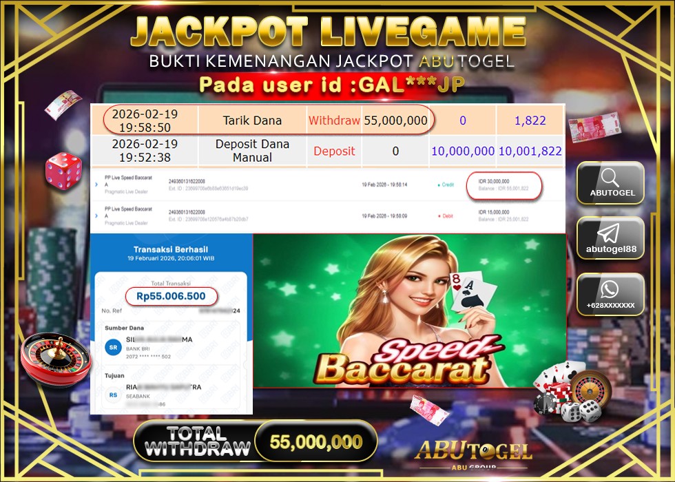 Bukti Jackpot Live Casino Online ABUTOGEL Jumat, 20 February 2026 Rp. 55,000,000 - LUNAS