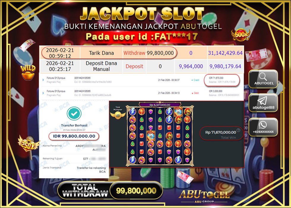 Bukti Jackpot Slot Online ABUTOGEL Sabtu, 21 February 2026 Rp 99,800,000 - LUNAS